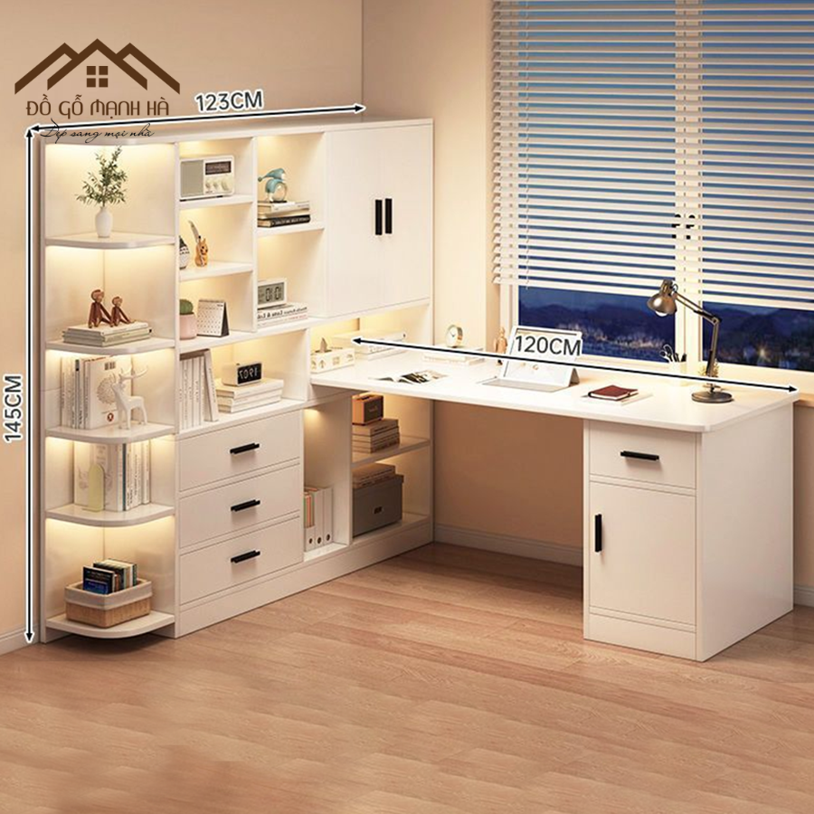 Mẫu bàn làm việc tích hợp giá sách thông minh là lựa chọn lý tưởng cho không gian hiện đại, đặc biệt phù hợp với căn hộ chung cư, phòng ngủ hay văn phòng tại nhà. Thiết kế chữ L giúp tận dụng tối đa diện tích góc tường, đồng thời mang lại không gian lưu trữ rộng rãi và góc làm việc ngăn nắp – chuyên nghiệp.
