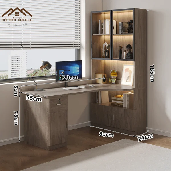 Thiết kế: Bàn chữ L tích hợp kệ sách, tủ trang trí, hộc tủ có khóa
