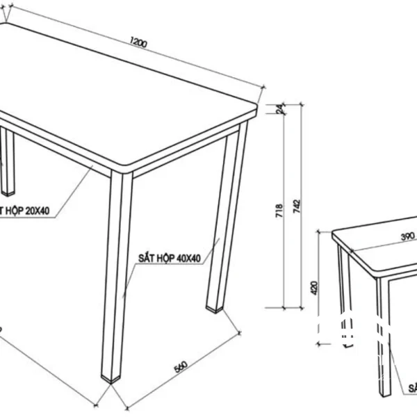 Bàn ăn: Dài từ 80cm đến 120cm x Rộng 60cm x Cao 75cm