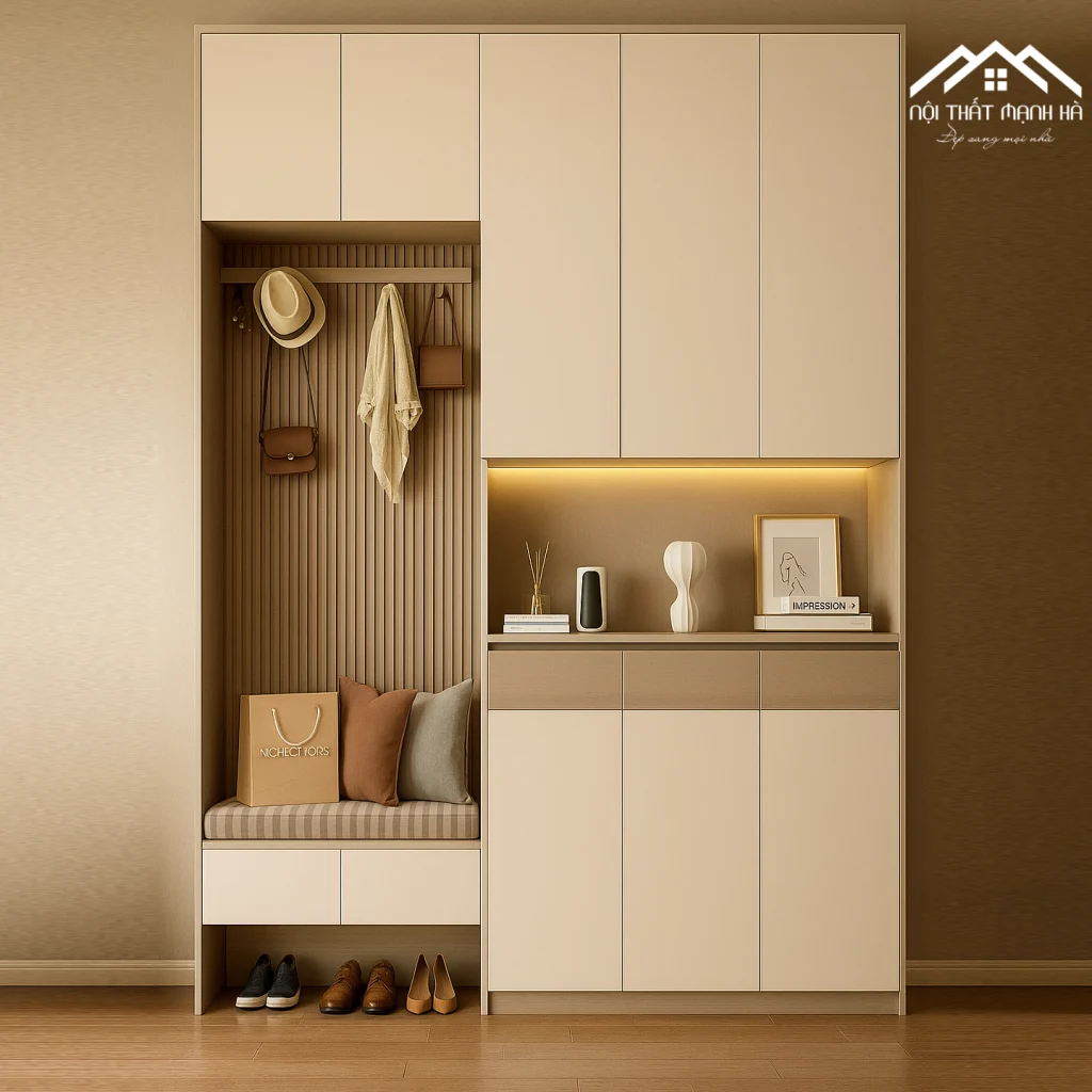 ✅ Thiết kế thông minh: Tích hợp cả khu vực để giày dép, kệ ngồi thay giày, hộc lưu trữ và khu vực treo đồ tiện lợi.