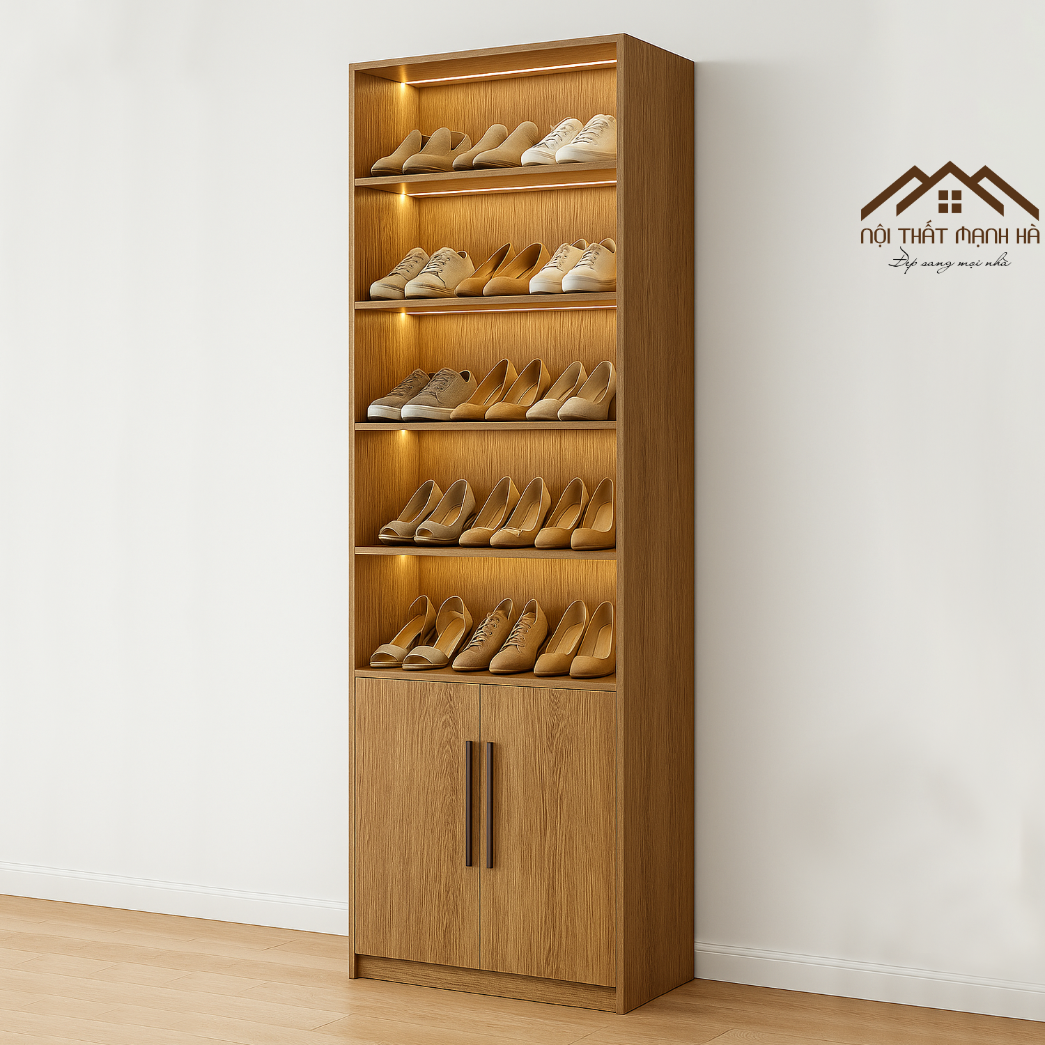 Thiết kế gồm nhiều tầng kệ, chứa được từ 30–40 đôi giày, phù hợp cho gia đình từ 4–6 người. Tầng trên tích hợp đèn LED ánh sáng vàng ấm, không chỉ tăng tính thẩm mỹ mà còn giúp lấy giày tiện lợi vào buổi tối.